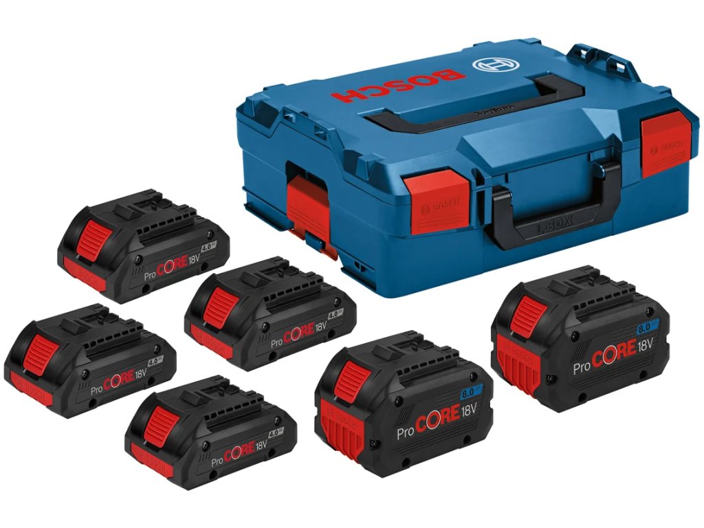 Sada akumulátorů Bosch obsahuje 4 akumulátory ProCore 18V 4Ah a 2 akumulátory ProCore 18V 8Ah, které jsou dodávány v praktickém kufru Bosch L-BOXX.Tyto výkonné akumulátory jsou navrženy pro maximální výkon a dlouhou životnost, využívají nejnovější technologii článků, která snižuje vnitřní odpor a produkci tepla.