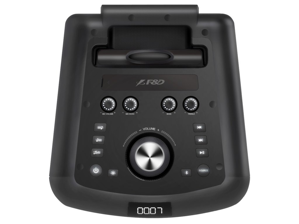 Přenosný párty reproduktory Fenda F&D PA300, který zaplní místnost silným zvukem o celkovém výkonu 100 W RMS a rozproudí každý večírek. Díky kolečkům a madlu můžete reproduktor snadno transportovat na požadované místo, na stylovém párty vzhledu se podílí také barevné LED podsvícení. Poslech hudby zajišťuje FM rádio, ale můžete také přehrávat songy z vlastní kolekce ze smartphonů nebo tabletů díky rozhraní Bluetooth. Reproduktor Fenda F&D PA300 zahrnuje také USB port pro přehrávání z přenosných flashdisků a nechybí ani vstup pro mikrofon pro vaše vlastní hudební výstupy a karaoke párty. K dispozici je také dálkové ovládání pro snadnou kontrolu.