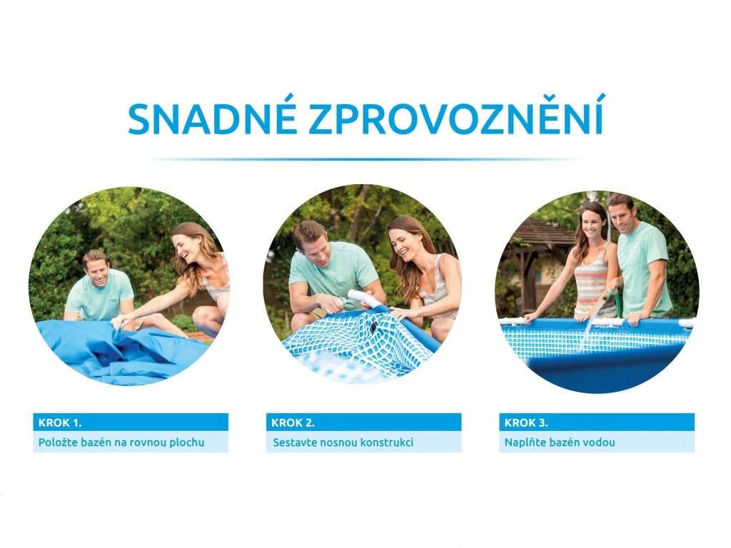 Prostě jen připravte místo, kde bude váš bazén stát. Rozviňte bazénovou podložku a rozbalte bazén. Pak už jen stačí sestavit podpěrnou konstrukci, navléci na ní fólii a začít napouštět vodu. Vybalení a smontování je jednoduché. Od chvíle, kdy začnete roztahovat fólii, až po začátek plnění vodou uplyne maximálně půl hodiny.