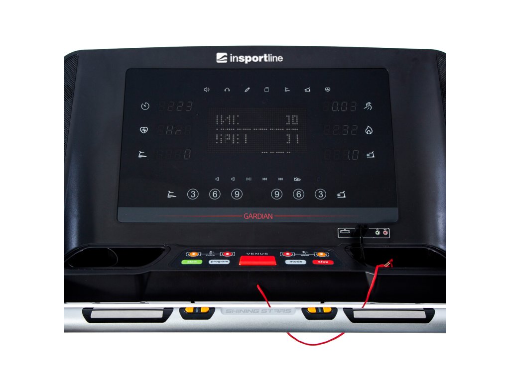 Pás inSPORTline Gardian G8 disponuje bohatou programovou výbavou. Je vybaven 24 přednastavenými programy, dvěma uživatelskými programy a třemi HRC programy fungujícími na základě stanovené tepové frekvence snímané pomocí vestavěných snímačů v madlech. Veškeré informace se zobrazují na velké obrazovce o úhlopříčce 18,5", pod kterou jsou zároveň veškerá ovládací tlačítka, včetně rychlého nastavování rychlosti a sklonu. Jedná se o zobrazování především času, rychlosti, skonu, vzdálenosti, tepové frekvence a spálených kalorií.