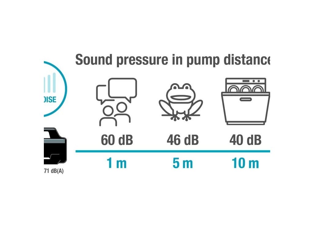 Zahradní čerpadlo 5000 Silent bylo navrženo tak, aby snižovalo hluk spojený s čerpáním. Tichá technologie vytváří hluk pouze 60 dB ve vzdálenosti 1 m a klesá na 40 dB ve vzdálenosti 10 m. To znamená, že čerpadlo je sotva slyšitelné.