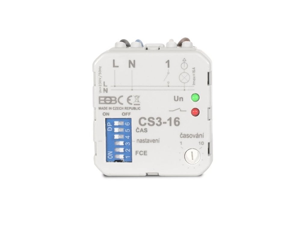 Vlastnosti CS3-16:je multifunkční časové relé pro ovládání odporové (žárovky) a indukční zátěže (ventilátory) s možností montáže POD VYPÍNAČ , spínacím prvkem je silové relé 16A.