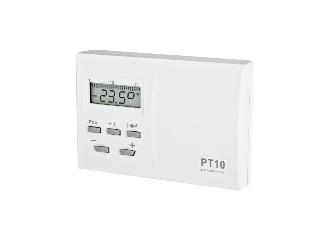 Vlastnosti prostorového termostatu PT10:je digitální prostorový termostat pro automatickou regulaci vytápění s možností nastavení 4 teplotních změn na každý den (minimální nastavitelný časový úsek je 30 minut).