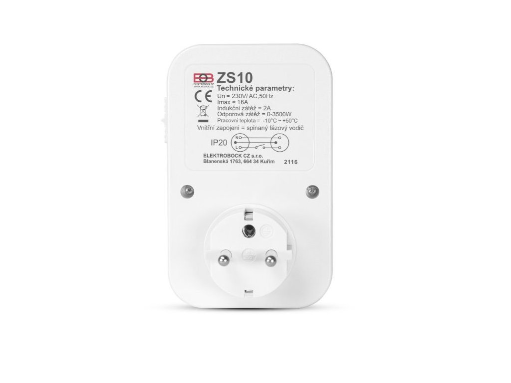 Vlastnosti spínacích hodin ZS10:Pokud potřebujeme zapnout a vypnout spotřebič v určitém časovém rozmezí. Umožňuje funkci trvalého sepnutí zásuvky pomocí dvoupolohového přepínače. Tato funkce je indikována červenou LED diodou na čelní straně přístroje. Slouží pro časové spínání domácích spotřebičů (0–3500 W).