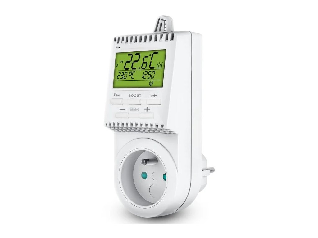 Vlastnosti tepelně spínané zásuvky TS30:digitální tepelně spínáná zásuvka pro automatickou regulaci elektrických topných i chladící soustav (přímotopy, vysoušeče ručníků, krby, klimatizace) v rodinných domech, bytech, kancelářích. Je možné nastavit až šest časových intervalů s různými teplotními úrovněmi na každý den. Je vhodná do míst, kde se využívá přepínání NT a VT (nízkého a vysokého tarifu). Toto krátkodobé vypínání nezkracuje životnost přístroje a díky záloze času přístroj po obnovení napájení pokračuje v nastaveném programu.