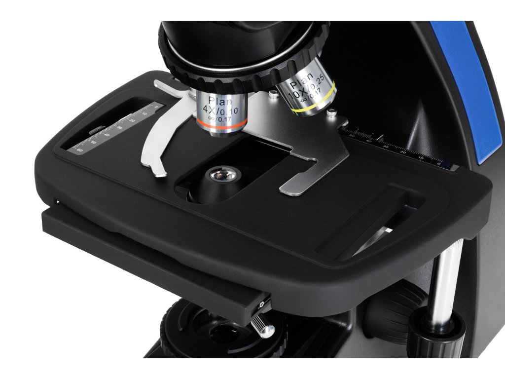 Zaostřovací mechanismus je vybaven integrovaným makrošroubem a mikrošroubem. Dvousouřadnicový pracovní stolek se pohybuje horizontálním i vertikálním směrem - rozměry pracovního stolku jsou 140 x 155 mm. Posun zaostřovacího mechanismu a pracovního stolku je plynulý, nezasekává se a neklade odpor.