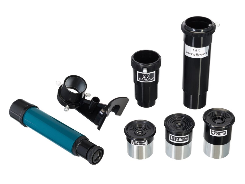 Bohaté příslušenství pak bylo pečlivě vybíráno tak, aby bylo možné využít všech klíčových vlastností optiky. Navíc mohou mladé dívky a kluci začít s pozorováním ihned po vybalení přístroje z krabice, nic dalšího již nepotřebují. Se 3 okuláry (6, 12,5 a 20mm) a Barlowovou čočkou tak dosáhnou nejvyššího možného výkonu, který umožní pozorování astronomických objektů v nejvyšším možném detailu. Při práci s teleskopem v rámci pozemních pozorování můžete použít dodávaný 1,5x vzpřimující okulár, který nabízí nepřevrácený a nezrcadlený obraz, takže tento teleskop poslouží také jako pozorovací dalekohled.