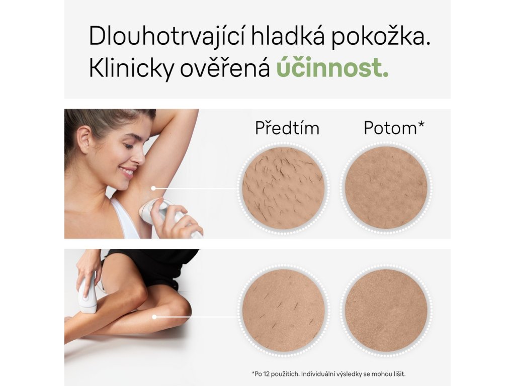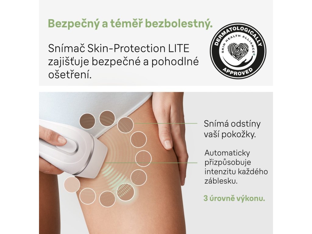 Šetrný k pokožce díky citlivému režimu, který snižuje intenzitu světla v choulostivých oblastech, jako jsou obličej, podpaží nebo intimní partie