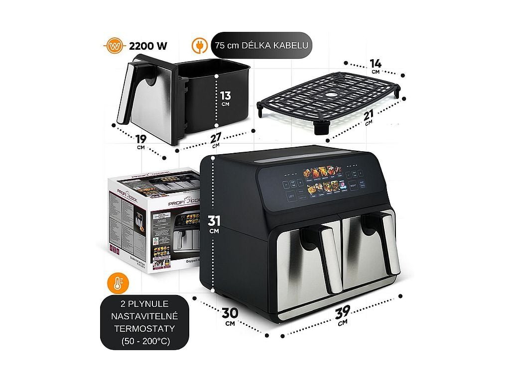 - Technologie: Vaření horkým vzduchem bez potřeby oleje a tuku.