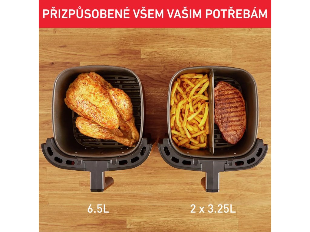 Máte velkou rodinu a fritézy se standardní kapacitou vám nestačí? Chcete si ušetřit čas a připravit maso i přílohu najednou? Vsaďte na novou horkovzdušnou fritézu Tefal Easy Fry & Gril 2v1 Inox EY801815 s XXL objemem a oddělovací přepážkou Flexcook, díky které můžete vařit dva pokrmy v jeden čas.