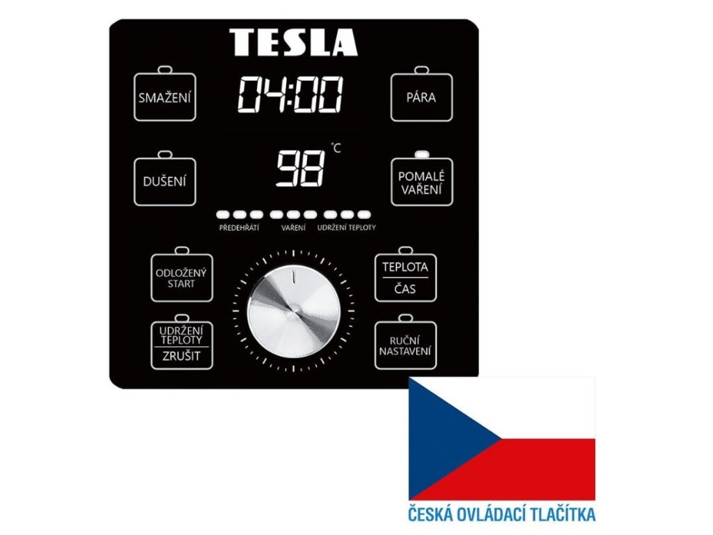 Ovládací tlačítka na předním panelu jsou v českém jazyce, což zajišťuje jednoduchou a intuitivní obsluhu, vhodnou pro všechny uživatele, bez ohledu na jejich zkušenosti s podobnými přístroji. Hrnec je vybaven přehledným digitálním displejem s bílým podsvícením a dotykovými tlačítky pro snadné a rychlé nastavení programu vaření. Po ukončení vaření se aktivuje funkce "Udržování teploty", takže jídlo zůstává teplé a připravené k servírování.