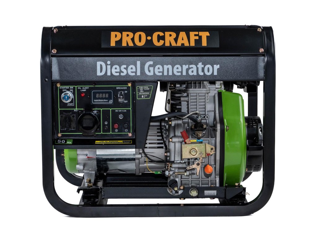 Dieselová elektrocentrála Procraft DP55 je určena k použití jako nezávislý generátor elektrického proudu při výpadcích elektřiny, jako zdroj energie při stavebnictví, v domácnosti, kde není elektrická síť dostupná. Výhodou je nižší spotřeba paliva a dlouhodobější použití než u benzinových elektrocentrál. Díky vysokému výkonu umožňuje napájení nejen domácích spotřebičů, ale i spotřebičů indukčního typu. Elektrocentrála má palivovou nádrž o objemu 12,5 l, čím zaručí dlouhý nepřetržitý provoz. Elektronický start zajišťuje rychlé spuštění motoru. Robustní ochranný rám umožňuje použití elektrocentrály v jakýkoliv podmínkách a taky usnadňuje transportování. Součástí dodávky je elektrická zástrčka, klíč na svíčku. Balení karton.