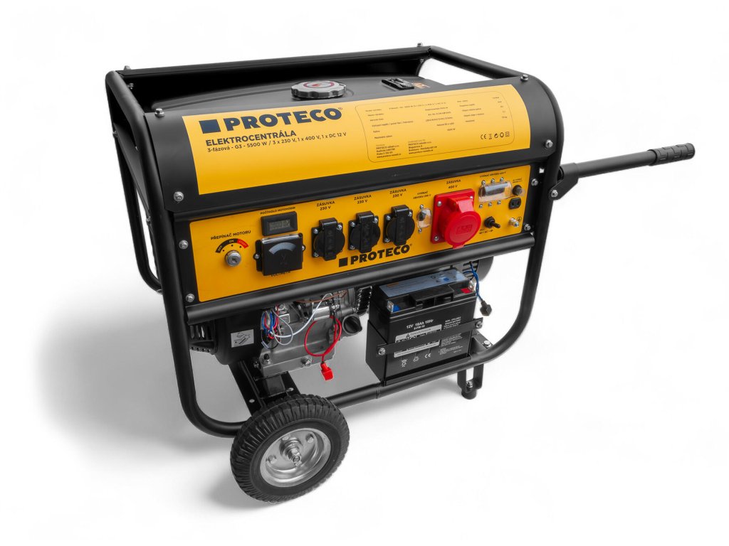 Benzínová elektrocentrála (generátor) PROTECO s výkonem 5500/3300 W, je vhodným pomocníkem jak v domácnosti, tak k náročnějším profesním účelům s potřebou napojení široké škály větších i menších strojů. Disponuje 400 V zásuvkou pro větší stroje, třemi standardními 230 V zásuvkami pro běžnou elektroniku a jednou 12 V zásuvkou pro menší elektroniku (autoelektroniku). Disponuje systémem elektrické regulace výstupního napětí AVR, který umožňuje připojení jemných elektronických přístrojů (např. TV přijímače, počítače atd.). Součástí je akumulátor 12V/17 Ah . Elektrocentrála je vybavena ručním i elektrickým startérem, voltmetrem pro měření vstupního napětí, automatickou kontrolou hladiny oleje a jističi na každé ze zásuvek pro ochranu před přetížením. V elektrocentrále je zabudovaná pohonná jednotka o objemu 389 ccm a výkonu 13 HP. Elektrocentrála má nádrž o objemu 25 litrů, s níž při 50% zatížení vydrží v provozu nepřetržitě až 15 hodin. Díky podvozku a madlům je lehčí s elektrocentrálou manipulovat. Výhody a charakteristické znaky - Elektrický a ruční startér - Systém AVR - automatická regulace výstupního napětí - Pohonná jednotka o objemu 389 ccm a výkonu 13 HP - Odolný trubkový rám pro tlumení vibrací - 3 x 230 V AC + 1 x 400 V AC + 1 x 12 V DC - voltmetr pro měření vstupního napětí - Jističe pro ochranu přetížení - Palivová nádrž 25 l - až 15 hod. nepřetržitého provozu - Dodáno bez náplní, před prvním startem je nutné nalít olej!.Při platbě penězi je možné dostat zajímavou nabídku neboli akční cenu a tu Vám rádi uděláme když napíšete na info@megabike-cyklo.cz