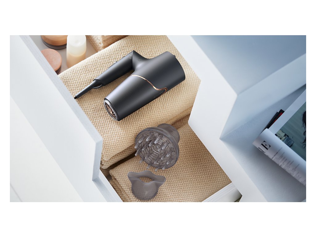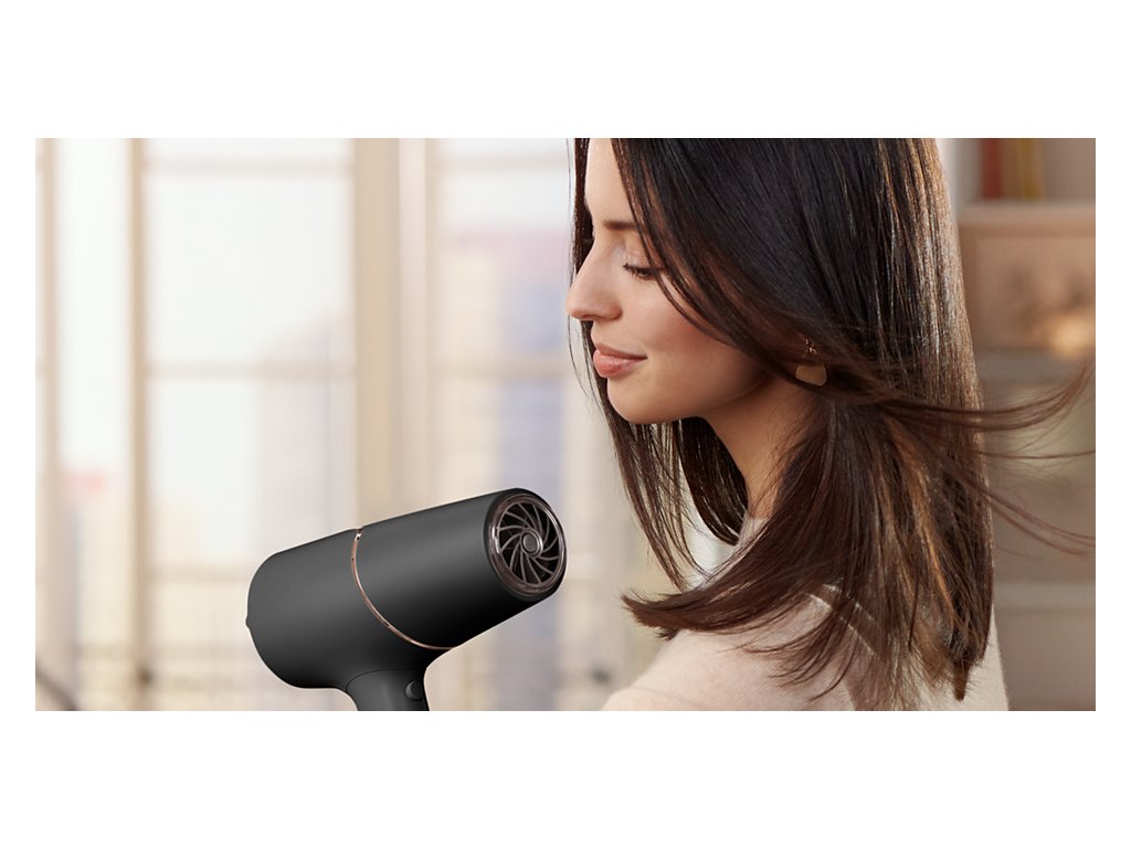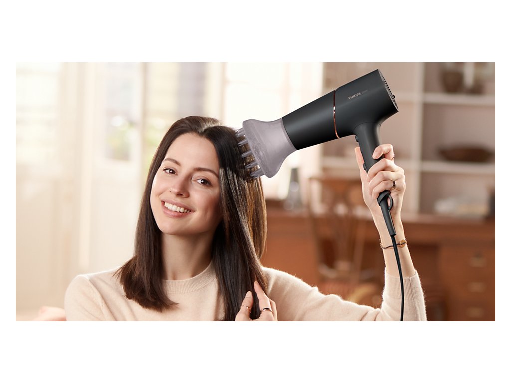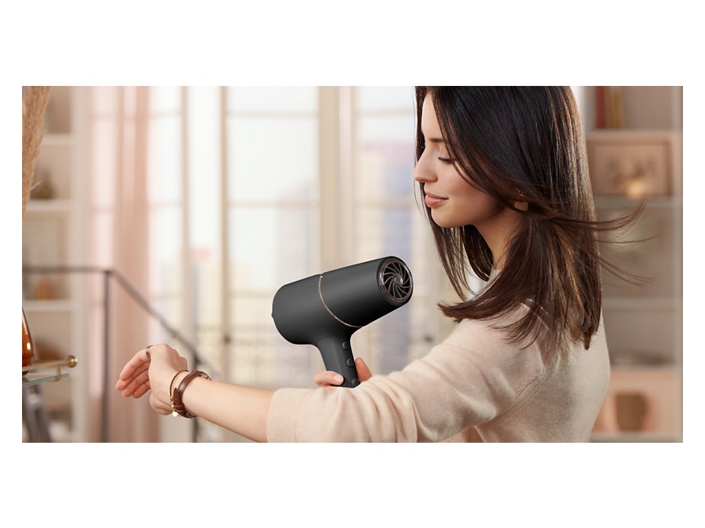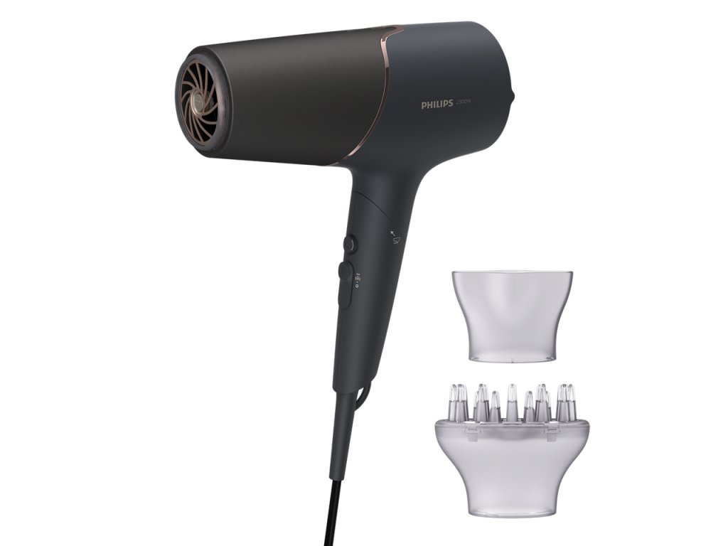 Vysoušeč vlasů Philips Series 5000, 2300W s technologií ThermoShield pro rychlé vysoušení bez tepelného poškození vlasů.8x více záporných iontů pro hladké a lesklé vlasy, minerální ionty pro UV ochranu.