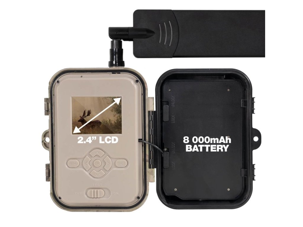 Zařízení je vybaveno výkonnou 8 000mAh baterií, která zajišťuje dlouhou výdrž, a podporuje připojení externího napájení nebo 12V baterie pro ještě delší provoz. Fotopast je odolná vůči extrémním teplotám, a proto ji lze používat po celý rok, ať už při mrazech nebo vysokých letních teplotách.