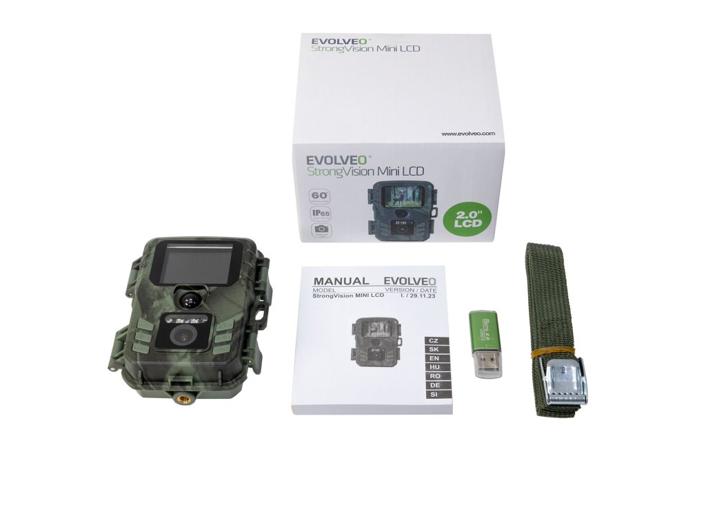 EVOLVEO StrongVision MINI LCD je dodávána jako kompletní sada, která obsahuje fotopast, montážní popruh, USB čtečku SD karet a podrobný manuál. Tento systém je připraven k okamžitému použití a nabízí vše, co potřebujete pro efektivní monitorování. Díky pokročilým funkcím, snadné instalaci a spolehlivému výkonu je EVOLVEO StrongVision MINI LCD vynikající investicí pro každého, kdo potřebuje kvalitní a efektivní monitorovací řešení.