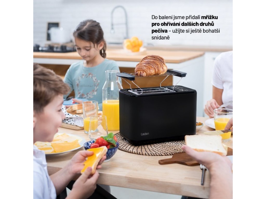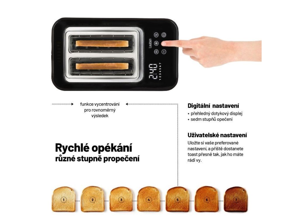 Křupavá snídaně za pár minutKřupavý toast k snídani namazaný máslem představuje pro mnohé dokonalý začátek dne. S Lauben Toaster 900BC získají vaše snídaně či svačiny zcela nový rozměr, díky digitálnímu nastavení na dotykovém displeji máte na výběr ze 7 stupňů intenzity opečení.