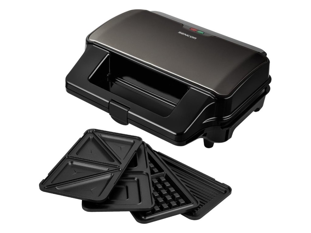 Rádi si v pohodlí domova dopřáváte toasty, panini, bagety a vafle? Pak vsaďte na Sencor sendvičovač s výměnnými deskami. Připraveny jsou pro vás rovnou čtyři vyměnitelné pečicí plochy pro jednotlivé druhy pečiva, dokonce i typický americký sendvič větší velikosti. Jistě vás oslní zajímavý metalický design. Zlatou barvu dobře zkombinujete s jakýmkoliv vzhledem kuchyňské linky. Výhodou sendvičovače je, že jsou jeho desky nepřilnavé, a tak se velmi snadno čistí.Základní vlastnosti produktu:
