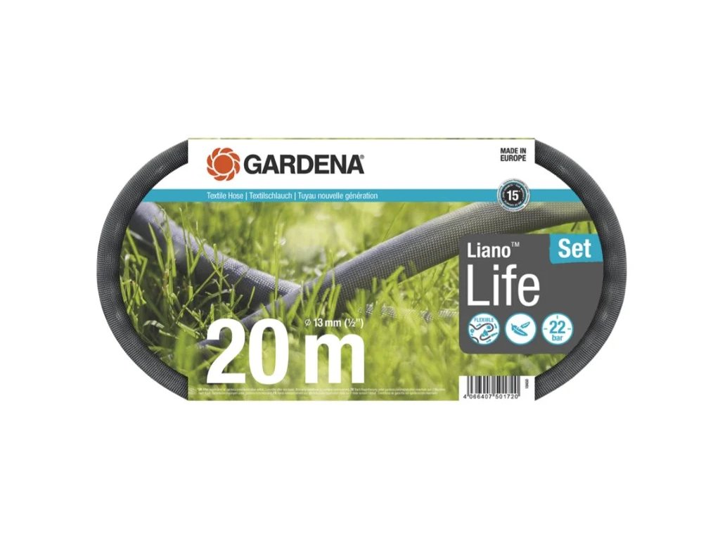 Textilní hadice Liano™ Life 20 m prodávaná jako sada značky GARDENA je připravena k okamžitému použití pro krátkodobé a střednědobé zavlažování nebo pro jednoduché úklidové práce. Sada obsahuje 20 m dlouhou hadici Liano™ Life s průměrem 13 mm (1/2") pro použití ve středně velkých zahradách, předmontované díly Original GARDENA systému: rychlospojku Liano™ a stopspojku Liano™, postřikovač a dvě šroubení na vodovodní kohoutek. Redukční spoj v jednom ze šroubení umožňuje připojit textilní hadici celkem ke třem velikostem vodovodního kohoutku. Zahradní hadice získává svůj spolehlivý výkon díky flexibilní vnitřní hadici z PVC a inovativní vnější hadici vyrobené z odolné textilní tkaniny. Při zavlažování nebo čištění je elasticita skvělou podporou, protože Liano™ Life se neláme a je méně pravděpodobné, že se zasekne na překážkách. Hadice Liano™ Life je až o 50 % lehčí než běžné PVC hadice . Díky tomu je její tahání po podlaze snadné. Díky příjemnému úchopu je manipulace pohodlná i po delší dobu. Pokud jde o prostorově úsporné skladování, Liano™ Life se díky své flexibilitě přizpůsobí dostupnému úložnému prostoru, což zjednodušuje ukládání na polici nebo v garáži. Textilní hadice disponuje tlakem, při kterém dojde k jejímu prasknutí, 22 barů. Její ochrana proti UV záření a mrazu znamená, že ji můžete nechat venku po celý rok. Navíc neobsahuje škodlivé látky, a tedy ani ftaláty (<0,1 %), kadmium, olovo a baryum (<0,1 %). Textilní hadice Liano™ Life je kvalitní produkt vyrobený v Evropě a přichází s 15letou zárukou výrobce GARDENA po registraci na adrese gardena.com/registration do 3 měsíců od jejího zakoupení. Stvořena pro extrém. Navržena pro každý den. Textilní hadice Liano™.Doplňkové parametry