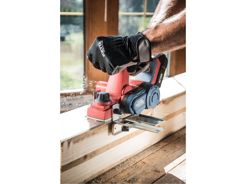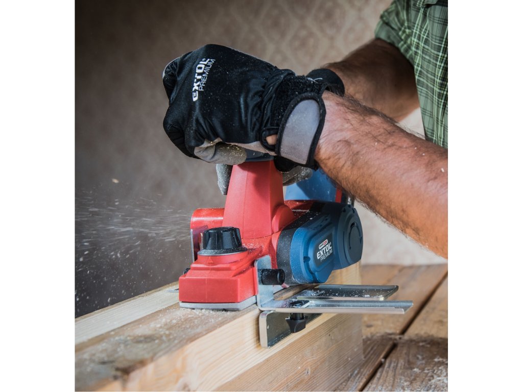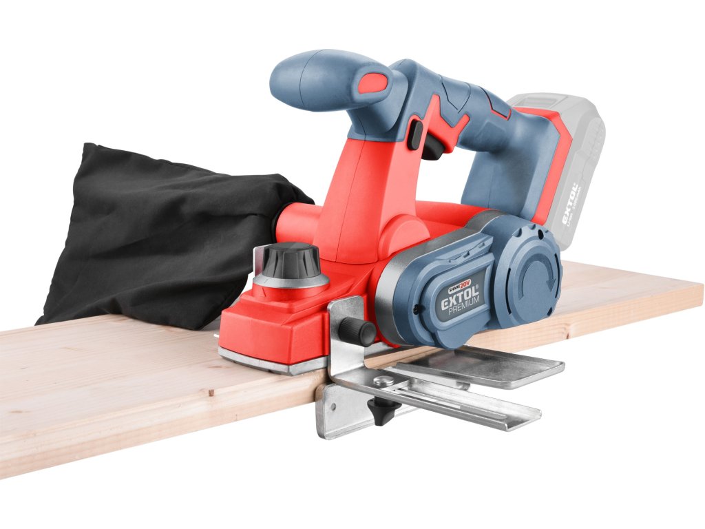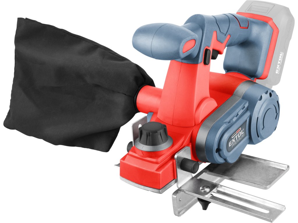 Aku hoblík Extol Premium kombinuje rychlost a výkonnost elektrického hoblíku s pohodlím akumulátorového nářadí. Výsledkem je rychlé a přesné odebrání materiálu bez překážejícího kabelu. Řezná hlava hoblíku má dva kvalitní břity. Ochranný trn v pracovní desce hoblíku chrání čepel i obráběný materiál tím, že udržuje čepel zvednutou a mimo kontakt s povrchem vašeho materiálu mezi řezy. Sběrný vak připojený na prachový výstup pomáhá udržovat pracovní prostor čistý a bez pilin. Přiložený adaptér pro falcování pomáhá vytvářet polodrážky ve vašich deskách a paralelní adaptér udržuje hoblík v nastavené vzdálenosti. Pro běžnou práci dostačují jeden nebo dva 2000mAh akumulátory, které můžete rychle nabít v rychlonabíječce, pro náročnější nebo delší práci doporučujeme větší akumulátory s kapacitou 4000–8000mAh. Akumulátor lze použít ve všech typech nářadí řady EXTOL SHARE20V. Díky použité Li-ion technologii je ho možné kdykoliv dobíjet, aniž by se tím snižovala jeho kapacita. Li-ion akumulátor ztrácí energii vlivem samovybíjení velmi pomalu a vydrží dlouho nabitý a připravený k použití.- hoblík je vybaven integrovaným systémem odsáváním pilin a třísek do sběrného vaku