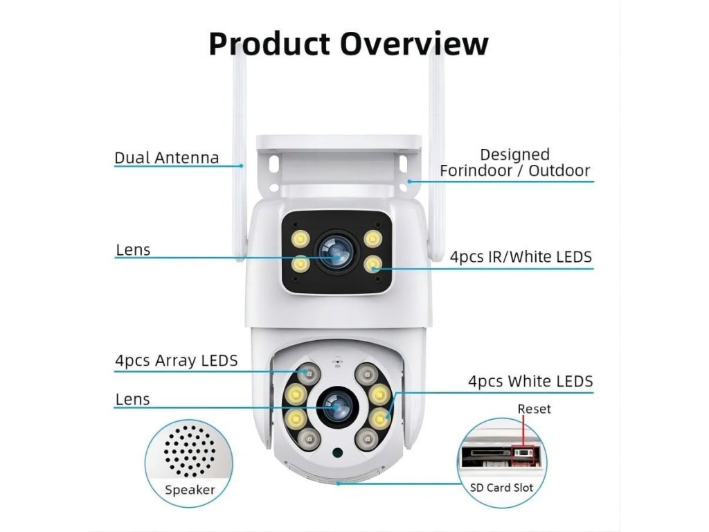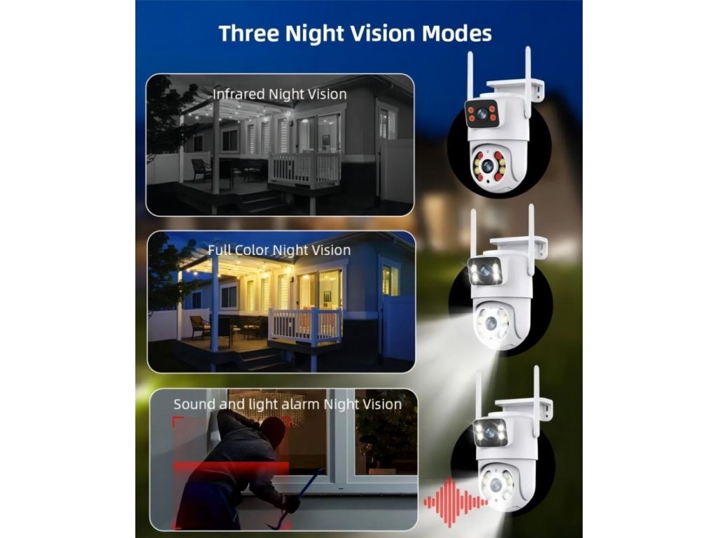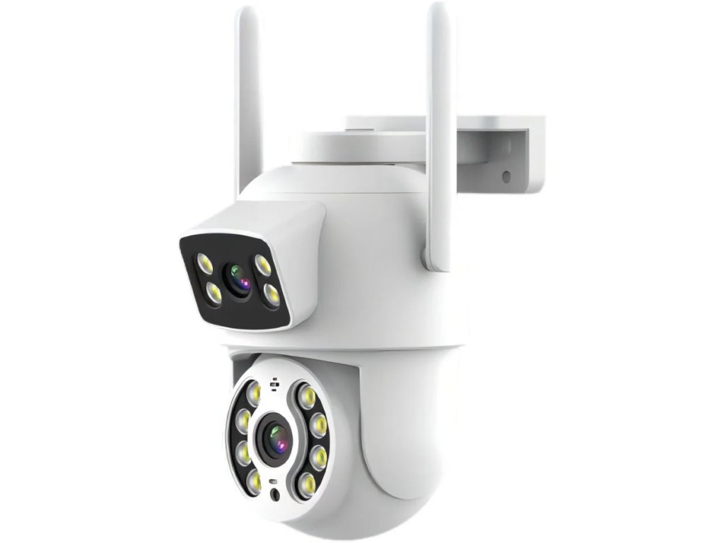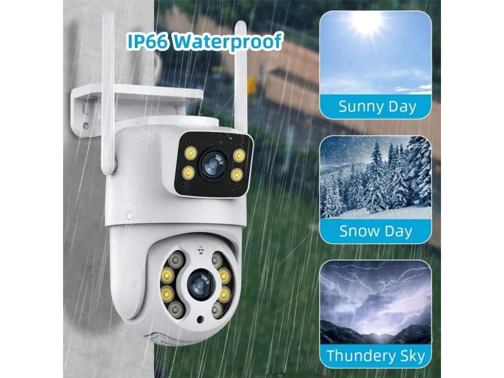 IMMAX NEO LITE SMART DOUBLE 07783LChytrá venkovní bezpečnostní kamera s detekcí pohybu disponuje otočným mechanismem pro monitorování v zorném úhlu 360°. Dva snímače nabízí rozlišení 2× 2 Mpx a jsou schopné snímat video v rozlišení 1920 × 1080 bodů. Pro případ zhoršených světelných podmínek je přítomen IR přísvit do vzdálenosti až 10 m. Součástí kamery je integrovaný reproduktor a mikrofon, který umožní kvalitní oboustrannou komunikaci. Připojení lze jednoduše realizovat bezdrátově skrze Wi-Fi. Propojení kamery pomocí aplikace v mobilním zařízení umožní pohodlný vzdálený přístup, ovládání kamery, pořizování záznamů či fotografií. Natočené záznamy je možné ukládat i na microSD kartu do kapacity až 128 GB.
