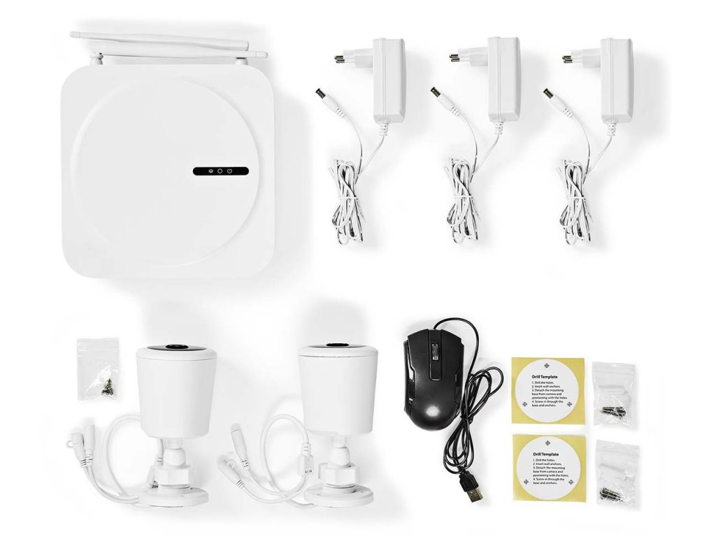 Obsah balení: 1x základní stanice (NVR), 2x kamera, 3x napájecí adaptér, USB myš, 2x vrtací šablona a 2x sada šroubů a hmoždinek.