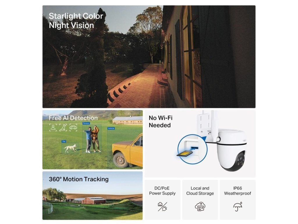 Tapo C501GWOutdoor Pan/Tilt 4G LTE CameraSPEC: 1080p (1920x1080), 4G LTE (LTE-FDD: B1/3/5/7/8/20/28, LTE-TDD: B38/40/41), 1 × External Antenna, 1 × PoE Port, Horizontal 360 deg. FEATURE: Pan/Tilt, Starlight Color Night Vision, Smart AI Detection and Notifications (motion, people, pets, cars), Sound and Light Alarm, Remote Control, Two-Way Audio, Voice Control (Works with Google Assistant and Alexa), Local Storage through microSD Card (Up to 512 GB), Tapo App, Weatherproof (IP66), Night Vision (Up to 30 m)Doplňkové parametry