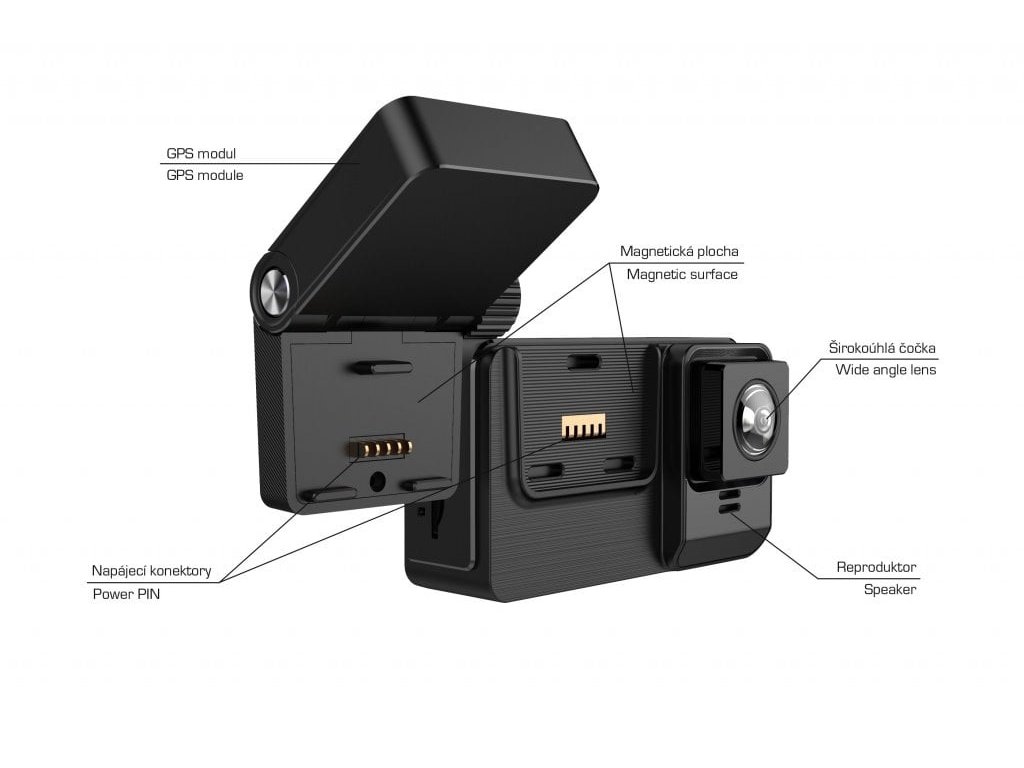 Součástí držáku kamery je také vestavěný GPS modul, díky kterému lze zpětně v počítači přehrát záznam včetně trasy v Google mapách, rychlosti a dat přetížení (nárazů) z G-senzoru. Pro co nejpřesnější informace pracuje modul se satelity GPS a Glonass.
