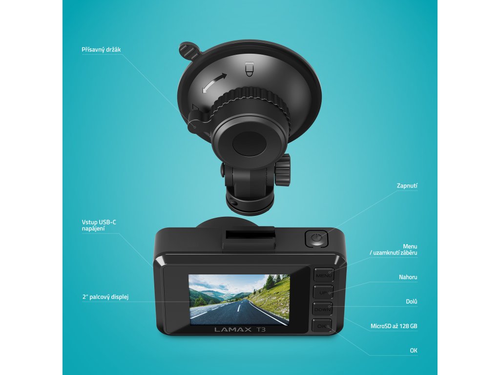 Nic jí neunikne a záběry ochráníProvoz na silnicích si žádá někdy opravdu pevné nervy a je taktické být připravený na ledacos. Když chceš předejít hádkám při případné kolizi nebo si prostě jenom zdokumentovat krásy, které po cestě vidíš, autokamera LAMAX T3 ti bude zdatně sekundovat. Pokud učíš nové řidiče, pořídíš s ní i super výukový materiál z reálného provozu. Záběry ukládá kamera v reálném Full HD a díky G-senzoru je automaticky ochrání, aby zůstaly po ruce pro případ potřeby. Ochranu záběrů můžeš zapnout i manuálně stiskem tlačítka. Vše si pak pohodlně uložíš na microSD o kapacitě až 128 GB. Neboj se, že by ti kamera zkolabovala v nejméně vhodnou chvíli, místo baterie je vybavena superkondenzátorem, který je odolnější. Pokud je kamera napojena na trvalé napájení, parkovací režim se postará o nonstop monitoring vozidla. Na přehledném 2” displeji vidíš vše potřebné, třeba při nastavování funkcí v českém menu, což zvládneš jednoduše jako nic. Designově vymazlená kamera skvěle sedne do přísavného držáku, který ji nepustí ani při dravější jízdě. Ještě je fajn vědět, že máš k dispozici USB-C konektor a za slušnou cenu dostaneš super krytí zad.