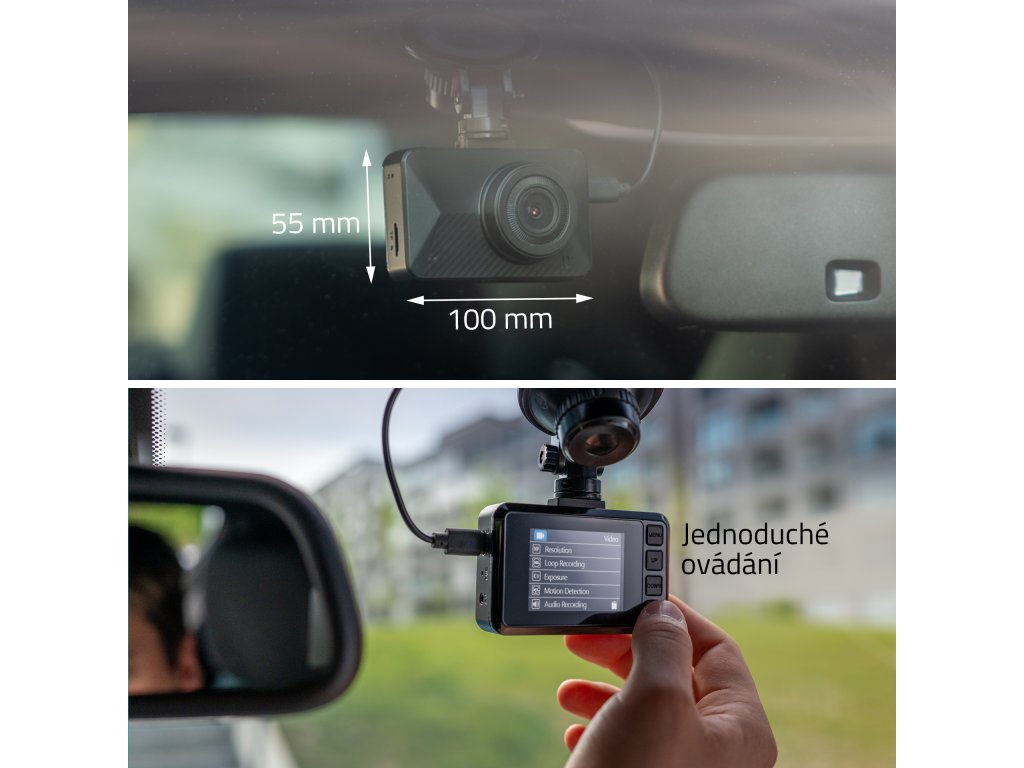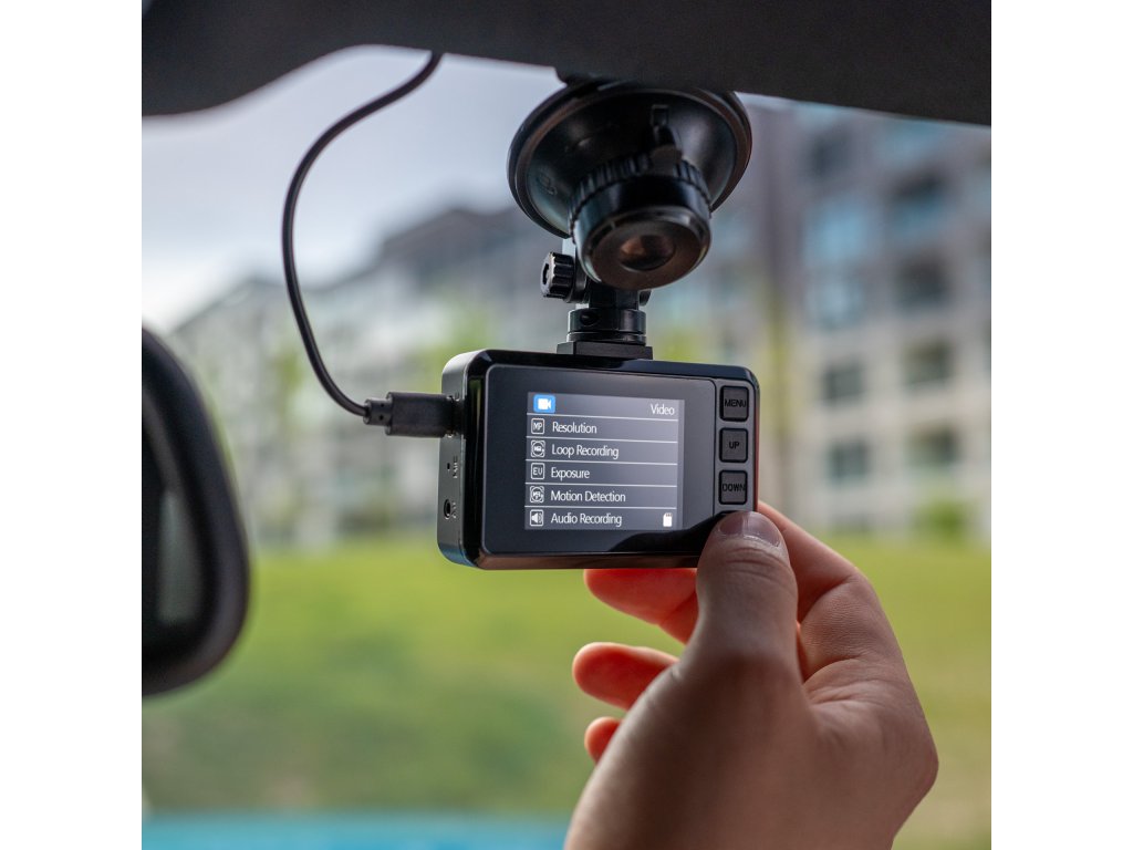 V jednoduchosti je krása, proto design i ovládání autokamery jsou přesně takové. České menu je navíc dokonale přehledné a zobrazí se ti na 2” displeji, který má i vychytaný spořič. Kameru propojíš prostřednictvím moderního USB-C konektoru a v její výbavě nechybí ani praktický přísavný držák, aby držela, kde má.