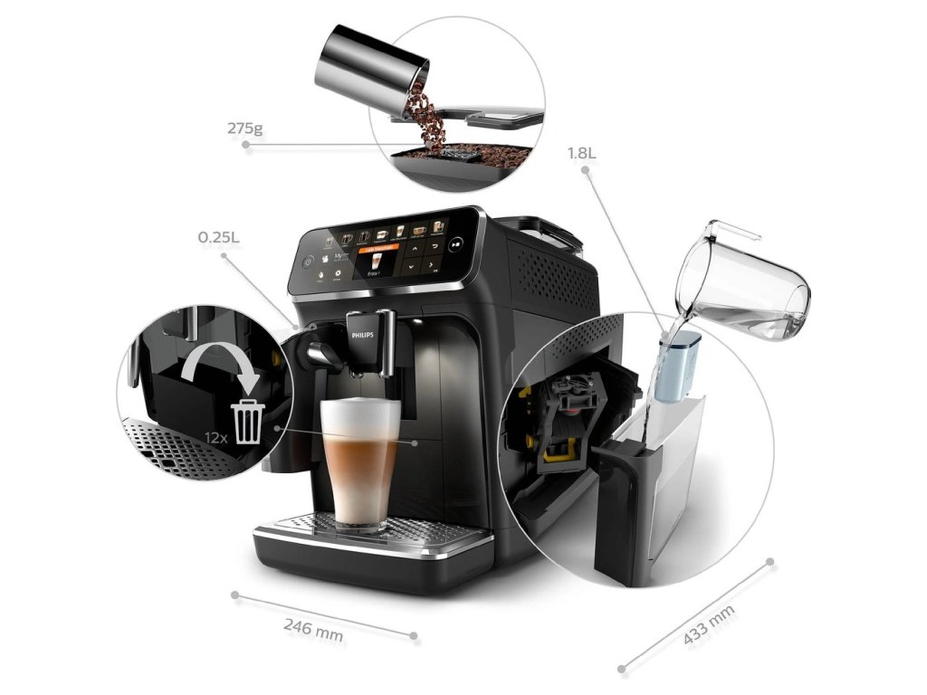 Funkce coffee customizer umožňuje vlastní přizpůsobení intenzity kávy a objemu mléka / kávy. Vysokorychlostní systém LatteGo se pak postará o dokonale jemnou mléčnou pěnu – míchá totiž mléko a vzduch velkou rychlostí v kulaté komoře a následně bez rozstřiku přidá vrstvu brilantně našlehané pěny o ideální teplotě.