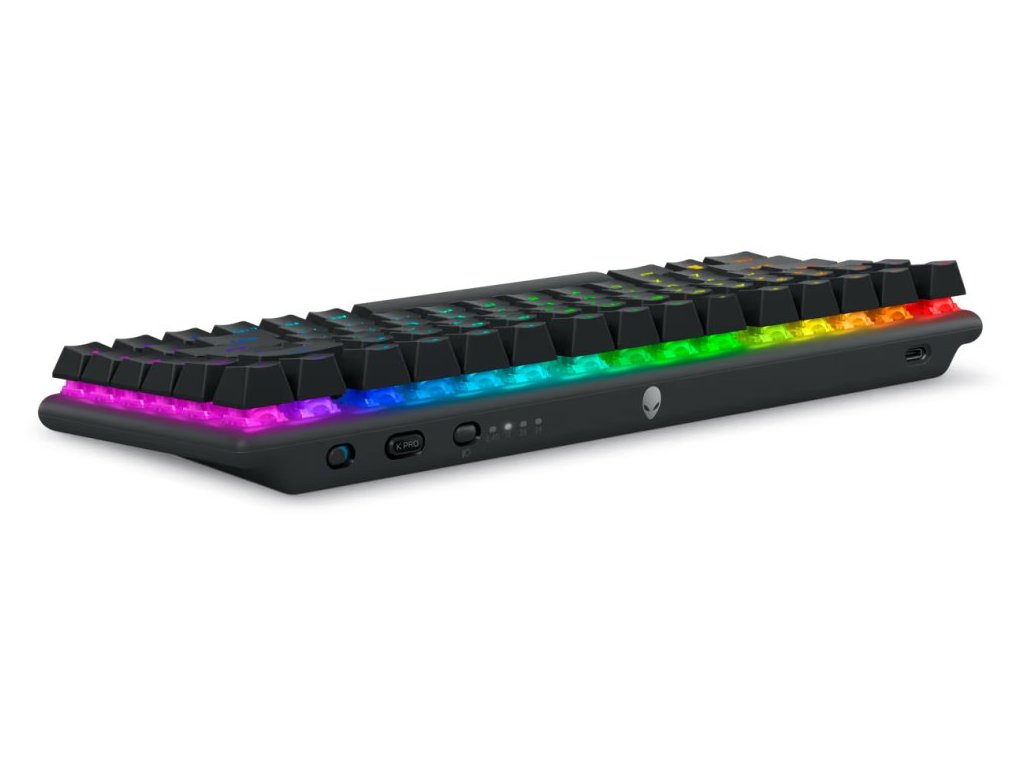Bezdrátová mechanická herní klávesnice je vybavena spínači Alienware Linear s perfektní odezvou a životností až 100 milionů stisků. Zajisté potěší také nastavitelné podsvícení AlienFX ve škále až 16,8 milionů barev. Samozřejmě nechybí ani funkce Anti-Ghosting a N-Key rollover. Připojení k počítači lze realizovat jak bezdrátově skrze Bluetooth či miniaturní USB přijímač a technologii 2,4 GHz, tak i drátově pomocí USB kabelu, který slouží zároveň pro nabíjení.