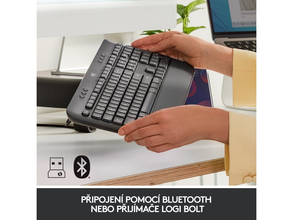 Připojení k zařízením je snadné díky bezdrátovému připojení prostřednictvím technologie Bluetooth Low Energy nebo přiloženého přijímače Logi Bolt USB. Získejte spolehlivé bezdrátové připojení na vzdálenost až 10 metrů, které vám umožní zůstat flexibilní v místě, kde pracujete, a přitom zajistit pořádek na stole a bez kabelů.