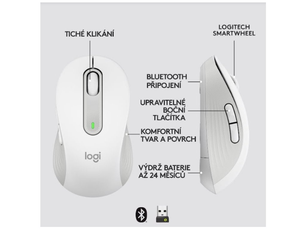 Bezdrátová technologie Bluetooth® Low Energy (Bluetooth 5.1) nebo přijímač Logi Bolt USB