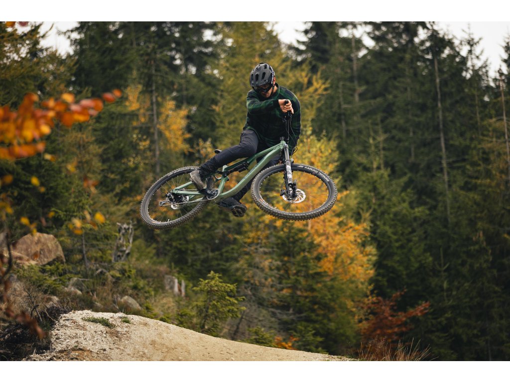 Ne každý polet je vždycky s čistým dopadem. Odolné enduro ráfky Rodi Tryp 30 ale zvládnou hrubší zacházení a sem tam nějakou hranu na doskoku odpustí. Pro ještě větší zábavu na trailech jsou obuté do kvalitních plášťů Schwalbe Tough Tom.
