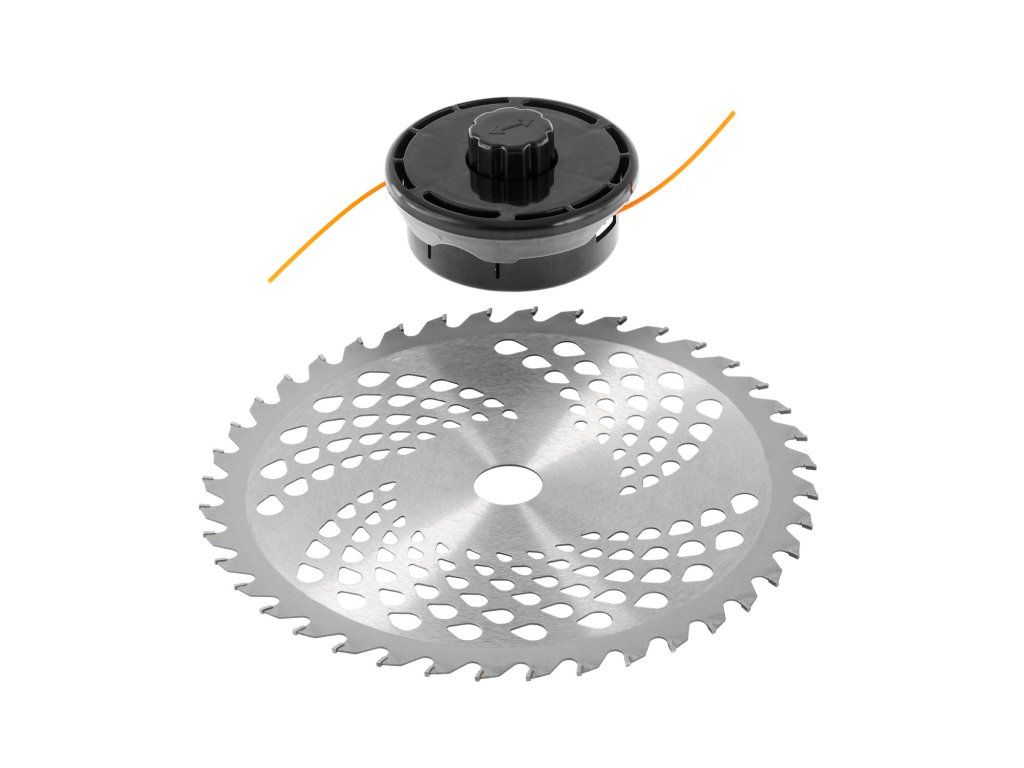 Univerzální výbava: součástí balení je strunová hlava se strunou o průměru 2,4 mm pro běžné sečení a pilový kotouč pro silnější porost, nálety a houževnatější vegetaci.