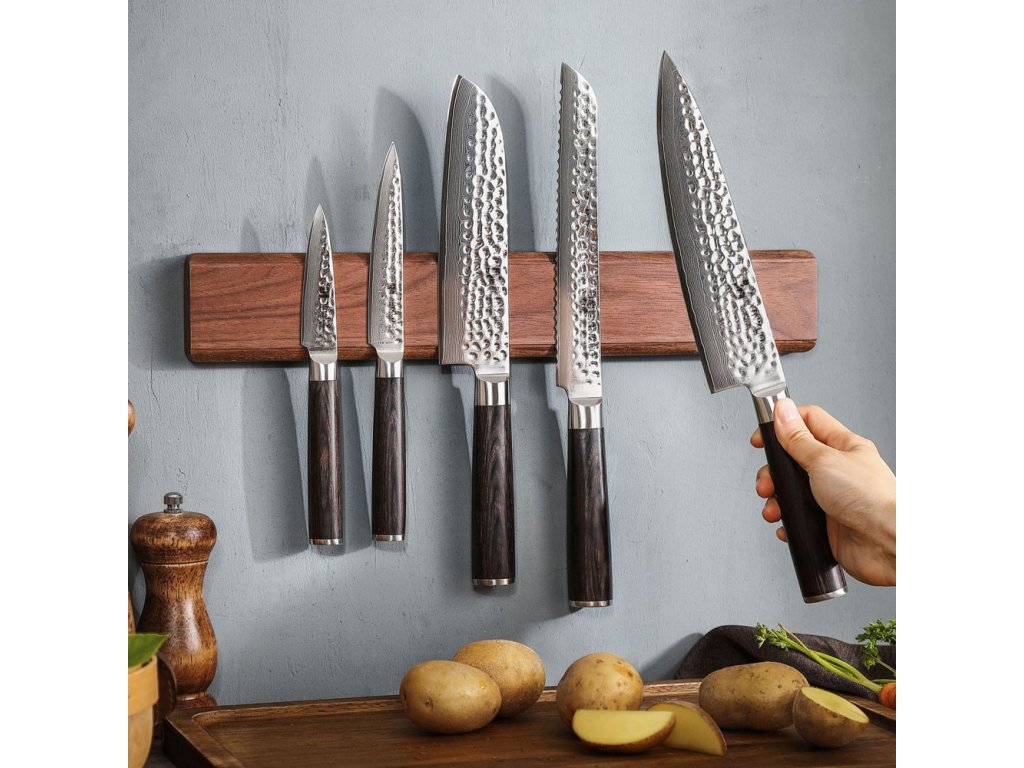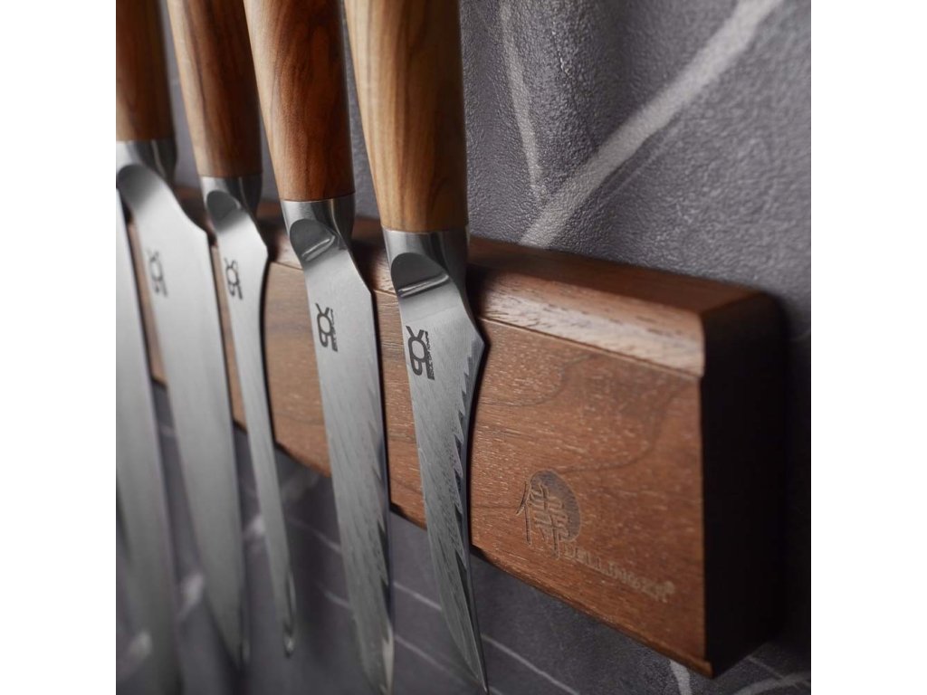 Po celé délce lišty se nacházejí silné magnety, které udrží nože bezpečně na místě. Navíc zamezíte vzájemnému dotýkání čepelí, a tím i jejich ztupení. Připevníte na ni až 6 nožů najednou. Provedení z kvalitního dřeva, ošetřeného směsí olejů a vosku, zaručuje její dlouhou životnost a odolnost.