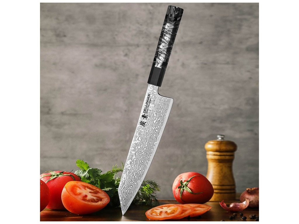 Elegantní nůž šéfkuchaře inspirovaný japonskou tradicí. Dellinger Chef/Kiritsuke 215 mm Carbon Fiber Octagon® kombinuje výjimečný design s VG10 jádrem (HRC 61±1) a osmihrannou karbonovou rukojetí pro maximální přesnost a pohodlí při krájení. Univerzální konstrukce umožňuje efektivní práci s masem, rybami i zeleninou.
