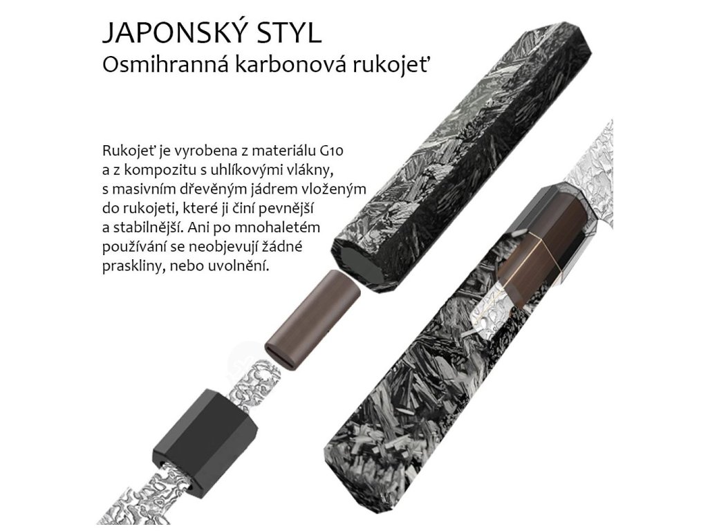 Jádro z VG10 damascénské oceli je obklopené 66 vrstvami nerezové oceli, což zajišťuje výjimečnou odolnost, pružnost a dlouhotrvající ostrost. Ice Hypnosis vzor na čepeli snižuje tření a usnadňuje krájení. Rukojeť z karbonu a G10 v tradičním osmihranném provedení perfektně padne do ruky, je odolná proti vlhkosti, teplu i opotřebení a nevyžaduje žádnou speciální údržbu. Vizuální vzhled evokující vesmír dodává noži luxusní charakter, který podtrhuje elegantní dárkové balení.