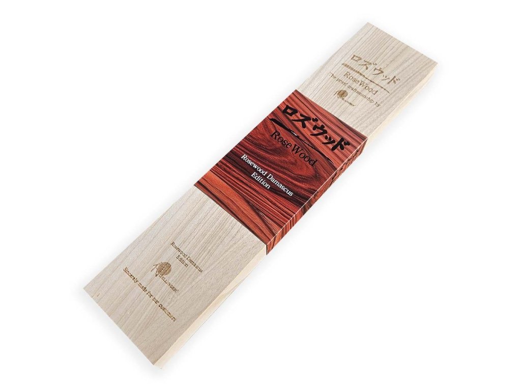 Rukojeť z luxusního dřeva Rose-Wood je ergonomicky tvarovaná pro maximální komfort při práci. Středový mozaikový nýt podtrhuje precizní řemeslné zpracování a každý kus je díky přírodní kresbě jedinečný. Dokonalé vyvážení zajišťuje stabilitu a usnadňuje manipulaci.