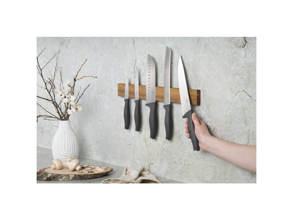 5 kvalitních nožů využijete na rozřezávání a krájení různých potravin. Najdete mezi nimi kuchařský a pracovní nůž, nůž Santoku, nůž na krájení a nůž na chléb. Zavěsíte je pohodlně na magnetický držák z akátového dřeva, který přimontujete ke stěně. Nože tak máte tedy neustále po ruce.