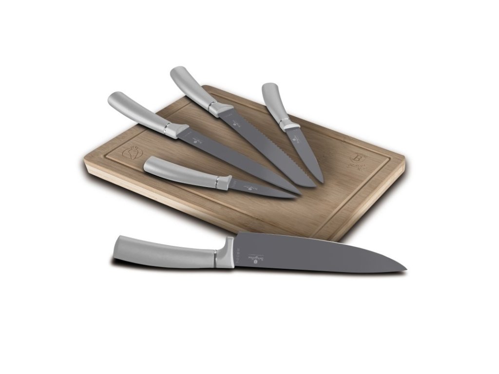 Sada Berlingerhaus Aspen Collection se skládá z 5 nožů a jednoho bambusového prkénka. Ostré čepele jsou potažené šedým nepřilnavým povrchem s antibakteriální úpravou. Krájené potraviny na nich neulpívají. Snadno je tedy očistíte.
