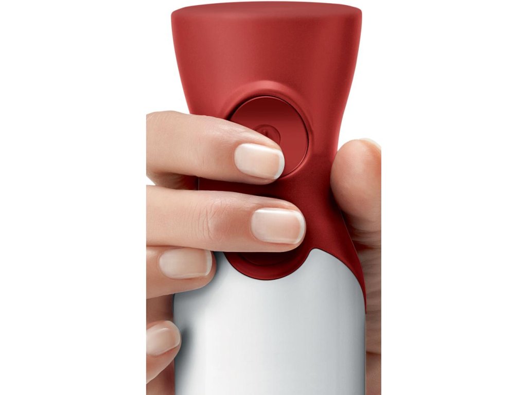 Perfektní úchop zajišťuje ergonomický tvar rukojeti a její SoftTouch povrch. Patentovaný Click-mechanismus dovoluje snadno nasadit i sejmout plastovou mixovací nohu a příslušenství. Součástí mixéru je mixovací nádoba s přehlednou měrkou a víčkem.