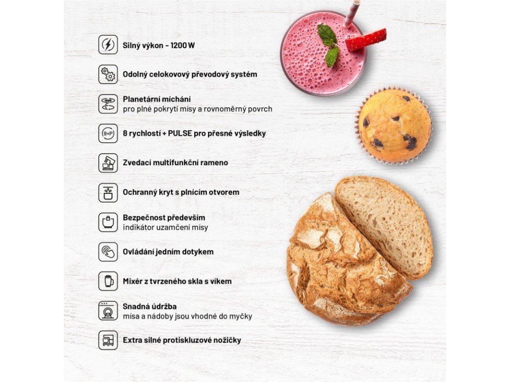 Váš kuchyňský superhrdinaLauben Kitchen Machine 1200WT je kuchyňský robot s bohatým příslušenstvím, díky kterému se za vás hravě postará o spoustu kuchyňských prací a zároveň vám ušetří místo v kuchyni. Ostudu vám v kuchyni neudělá ani vzhledem, což dokládá prestižní designové ocenění IF Design Award 2019. Míchání, šlehání, hnětení těsta i mletí masa, o to vše se spolehlivě postará spolehlivý měděný motor o výkonu 1200W a vysokozátěžové celokovové převody. Robot disponuje technologií EffectiMix® , která zajišťuje planetární mixovací pohyb a rovnoměrný výsledek. Díky systému SpeedPrecision® máte na výběr z 8 přesně kalibrovaných rychlostí a možnosti PULSE pro přesné výsledky. Hlavní mixovací nádoba je vyrobena z nerezové oceli a má kapacitu 5l. Robot jsme doplnili o mixovací sklenici z tvrzeného skla s víkem pro přidávání ingrediencí. Můžete ho tak využít k přípravě studených či vlažných polévek nebo čerstvých smoothies. Bezpečnost je vždy na prvním místě, proto je Lauben Kitchen Machine opatřen pojistkou, která ho spustí jen, je-li správně uzavřen, protiskluzovými nožkami a pojistkou proti přehřátí. Správné usazení mísy bude hračka díky barevnému indikátoru. Robot vás potěší i snadným ovládáním pomocí jediného tlačítka, nízkou hlučností a dvěma barevnými provedeními. Protože moc dobře víme, že není jednoduché každý den vymýšlet, čím nakrmíte rodinu či sebe, přidali jsme do balení kuchařku s recepty pro inspiraci.