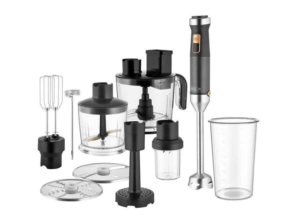 | Příslušenství: | šlehací metla, sekáček (chopper), mixovací nádoba, nástavec na pyré, minisekáček |
