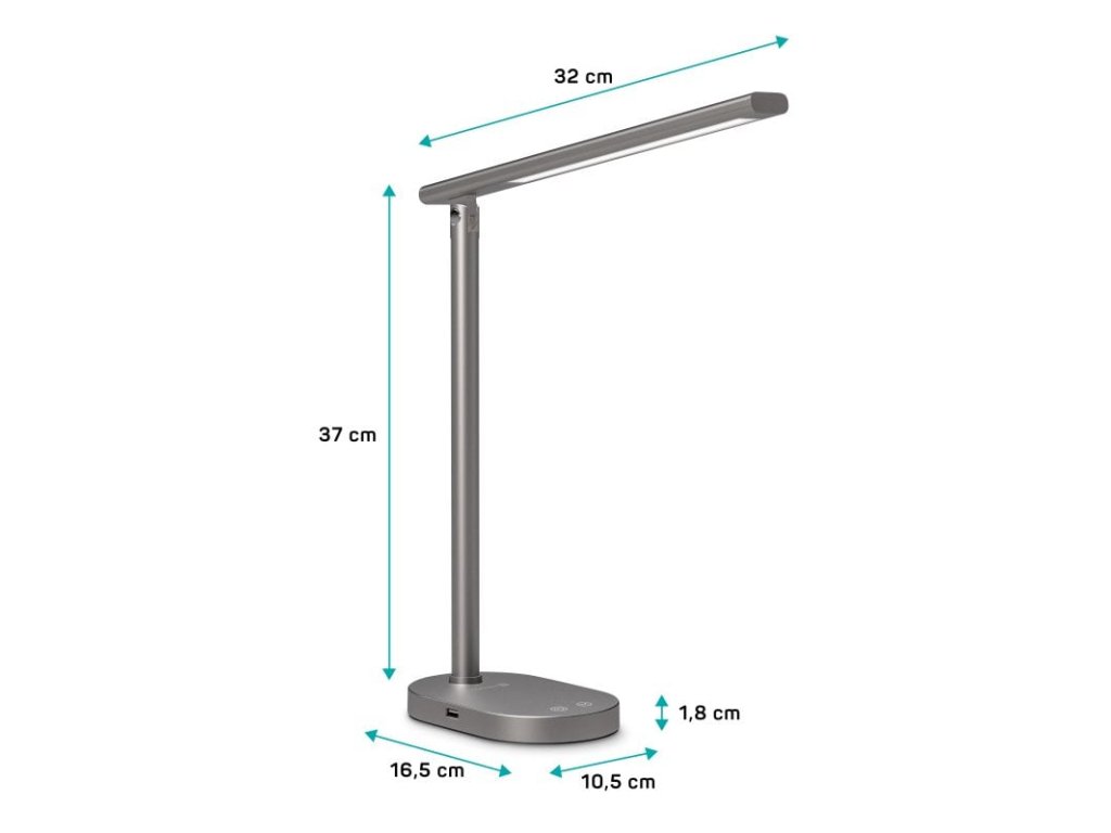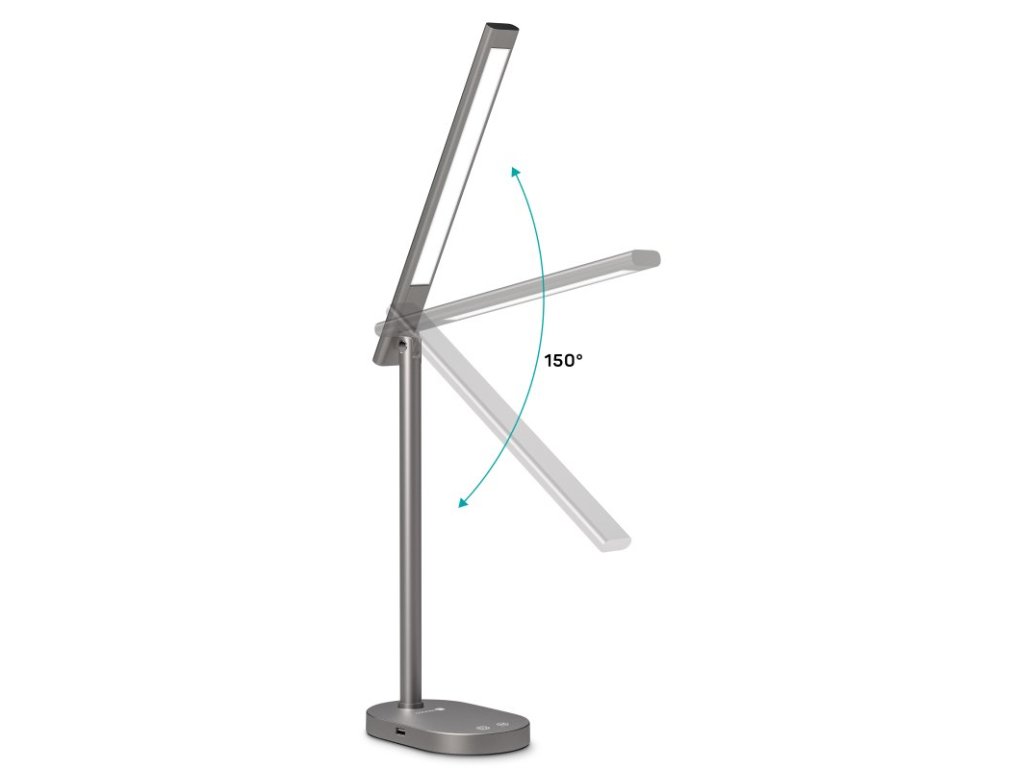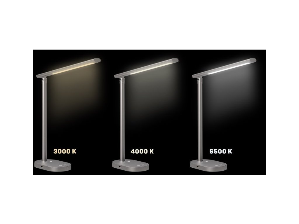 Díky sklopnému rameni nastavíte dokonalý úhel pro jakoukoliv práci. Lampička disponuje USB-A výstupem s výkonem 5 W a dvěma praktickými dotykovými spínači, které umožňují zapnout/vypnout lampu, nastavit 3 úrovně jasu světla nebo nastavit barevnou teplotu světla ve 3 různých úrovních (3000/4000/6500 K).
