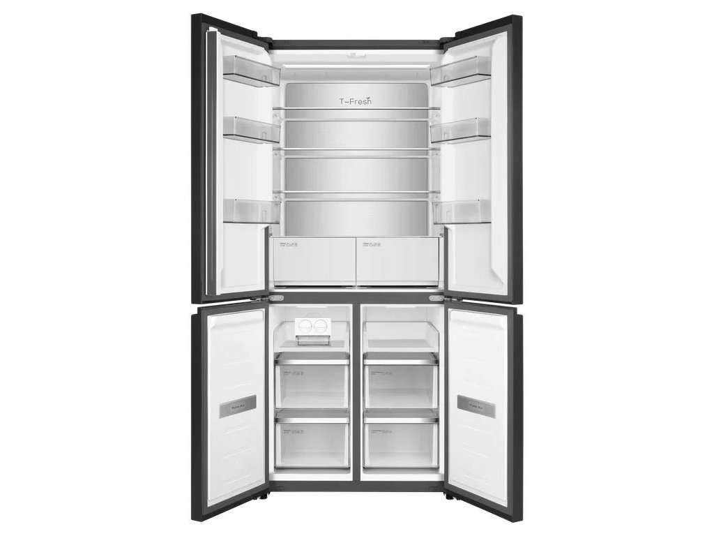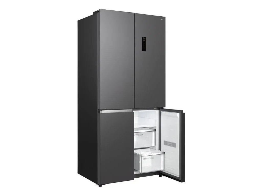Americká lednice - čtyřdveřová, energetická třída D, objem ledničky 312 l, objem mrazáku 144 l, 4 police, 6 přihrádek v mrazáku, 1 chladicí okruh, displej, LED osvětlení a nulový náběh dveří, rozměry 190 × 83,3 × 58 cm (V׊×H)Klíčové vlastnosti americké lednice TCL RC456CSD0