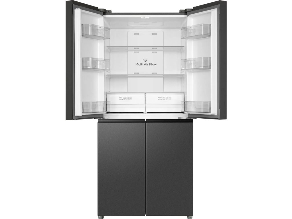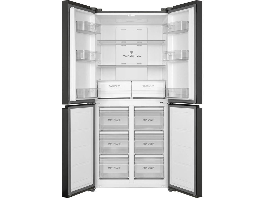 Americká lednice - čtyřdveřová, energetická třída E, objem ledničky 301 l, objem mrazáku 169 l, 2 police, 6 přihrádek v mrazáku, 1 chladicí okruh, displej, LED osvětlení a prázdninový režim, rozměry 185 × 83,3 × 67,8 cm (V׊×H)Invertorový kompresor