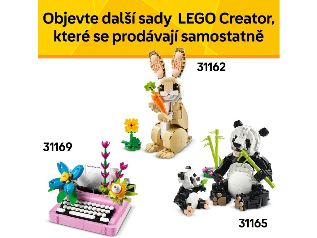 Potěšte milovníky domácích mazlíčků od 8 let rozkošnou stavebnicí LEGO® Creator 3 v 1 (31163) Hravá kočka. S touto stavebnicí domácích mazlíčků si postavíte roztomilou kočku s pohyblivou hlavou, ušima, ocasem a nohama a doplňky, včetně misky na krmení, myši a klubíčka, a děti se s ní můžou hrát na zábavné příběhy. Holky a kluci si s touto stavebnicí LEGO postaví hned 3 různé modely zvířátek ze stejných kostek: pohyblivou kočku, která může sedět, stát a skákat, pohyblivého roztomilého pejska s kostí a model holuba s drobky. Díky těmto 3 modelům se jedná o skvělý dárek LEGO, který si děti můžou vystavit a užít si s ním nápadité hraní. Stavebnice LEGO Creator 3 v 1 inspirují děti ke kreativnímu stavění – v každé krabici najdou dílky k sestavení a přestavování 3 různých modelů. Se stavebnicemi 3 v 1 si postaví modely inspirované jejich zájmy, včetně superrychlých vozidel, úžasných zvířat a propracovaných domů. Upozorňujeme, že modely nelze sestavit současně.Doplňkové parametry