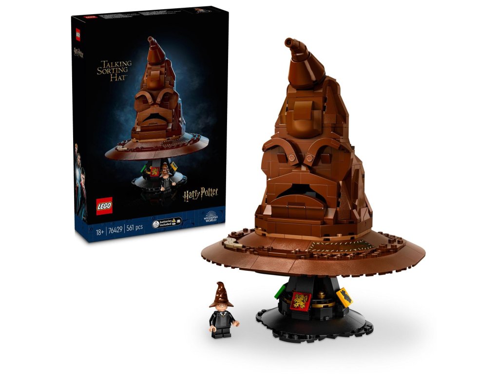 Ponořte se do stavění okouzlujícího modelu Mluvící Moudrý klobouk (76429). Jedná se o zcela první stavebnici z řady LEGO® Harry Potter™ se zvukovou kostkou, která tento model přivádí k životu. Dotkněte se špičky Moudrého klobouku nebo si ho položte na hlavu a aktivujte tak jeho hlas. Klobouk vám sdělí, do které bradavické koleje patříte. Občas také uslyšíte píseň Mluvícího klobouku.Umístěte klobouk na podstavec na vystavení, který je zdobený erby Nebelvíru, Zmijozelu, Mrzimoru a Havraspáru. Součástí této jedinečné stavebnice LEGO je také minifigurka Harryho Pottera s vlastním Mluvícím kloboukem, která výstavní model dokonale doplňuje.